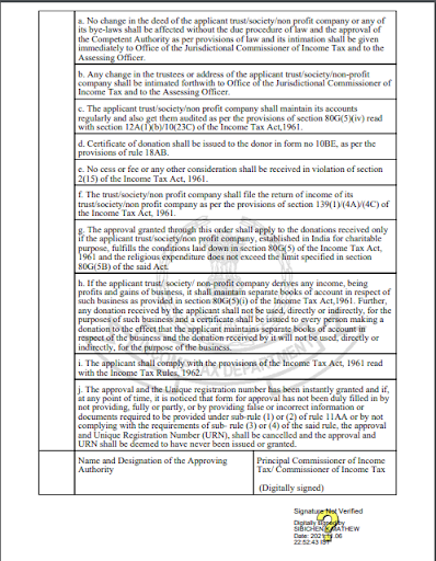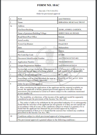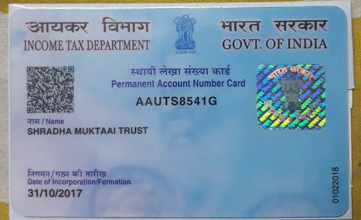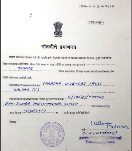 Shradha Muktaai Trust is registered under 12A of the Income Tax Act, 1961, (02-Sub clause (vi) of clause (ac) of sub-section (1) of section 12A) and with the Director of Income Tax (Exemption) u/s 80G (12-Clause (iv) of the first proviso to sub-section (5) of section 80G) valid until 2024.